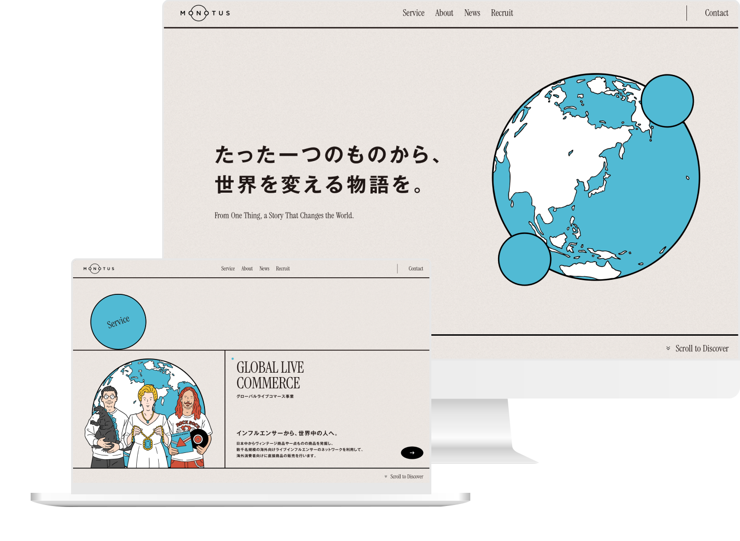 ライブコマースを活用し日本中からヴィンテージ商品や一点ものの商品を発掘し、ライブコマースでグローバルに展開する会社「MONOTUS.inc」の立ち上げに伴いコーポレートサイトを制作しました。PANORAMAでは、Webサイトの設計及びデザイン、実装、ディレクション、アートディレクションを担当させていただきました。