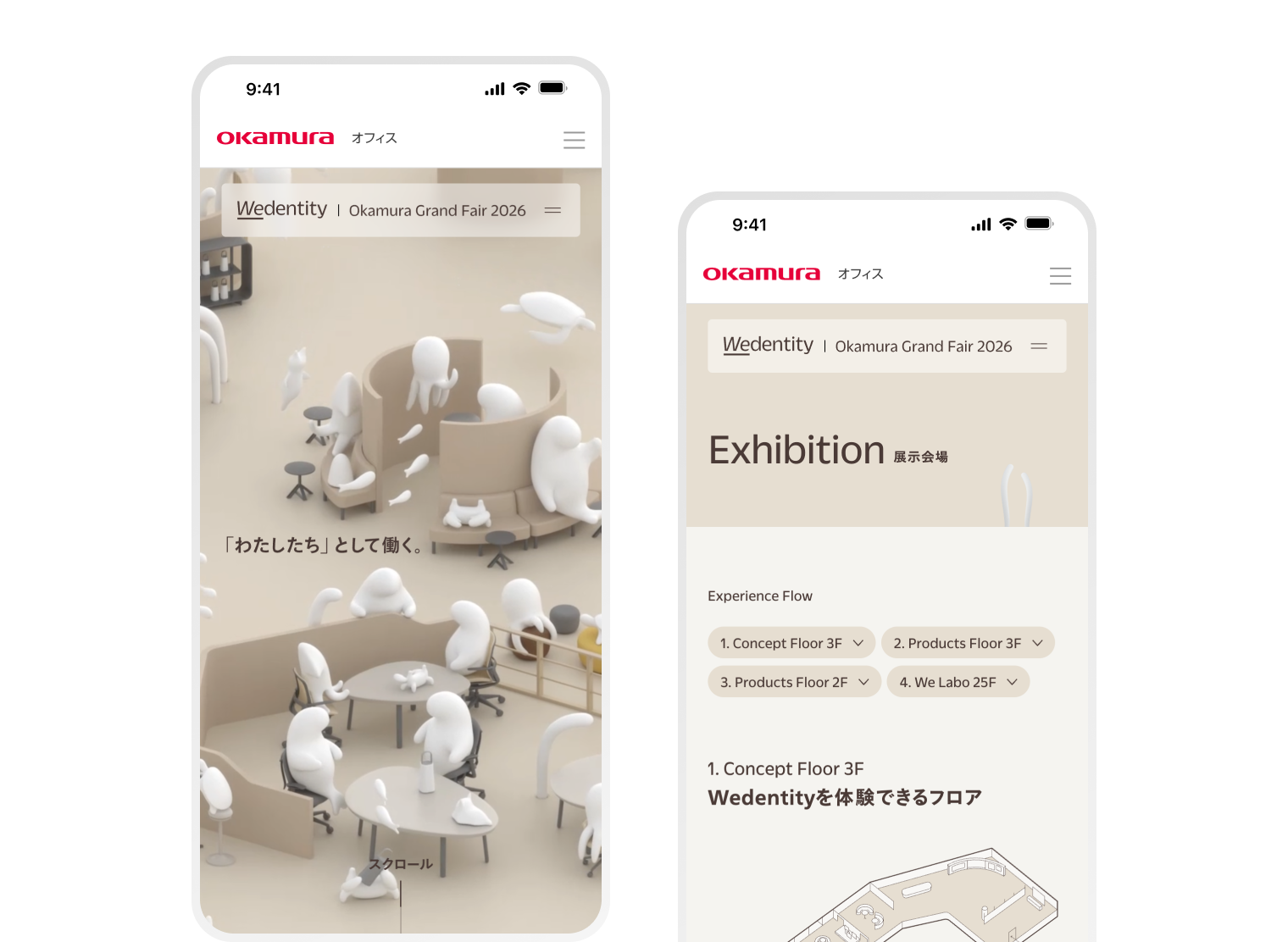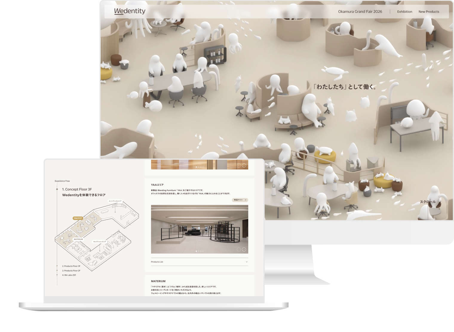 オフィス家具メーカーのOkamura様が開催する招待制イベント「Okamura Grand Fair 2026」。新しい働き方「Wedentity」をテーマに新製品の展示や体験をご案内する本イベントの、特設サイトを制作いたしました。日本デザインセンター様によるデザインと弊社の実装を連携させ、「Wedentity」の魅力を丁寧に届けるサイトに仕上げています。