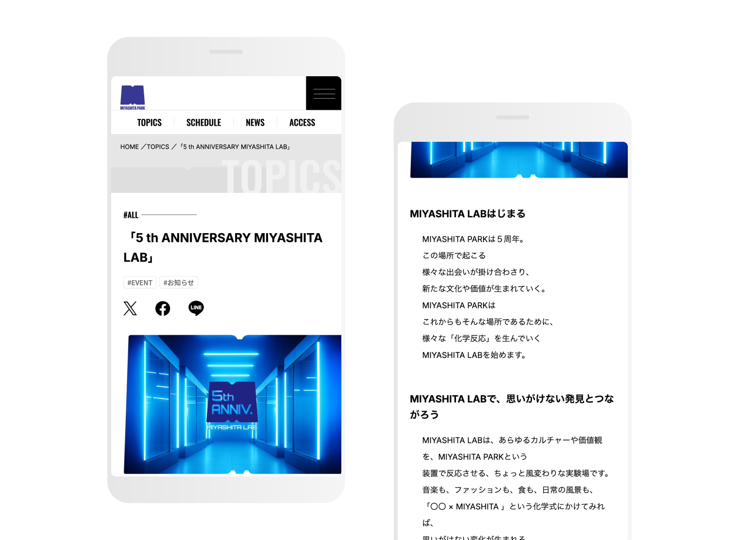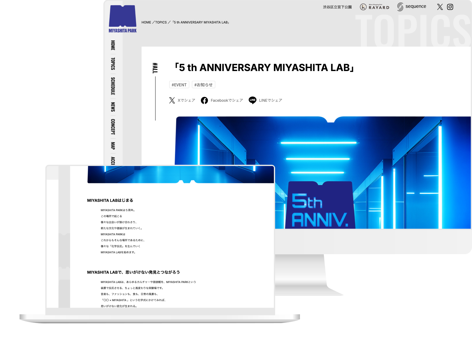 MIYASHITA PARK 5周年の情報発信起点となる「MIYASHITA LAB」。「周年イヤーで、常に何かが行われている」期待をつくるとともに、いまのMIYASHITA PARKの集大成であり、同時に次の5年への足がかりとなる本施策において、弊社では5周年ロゴとKVラフデザイン、各イベントの共通フレームとなるデザインシステムの制作を担当させていただきました。