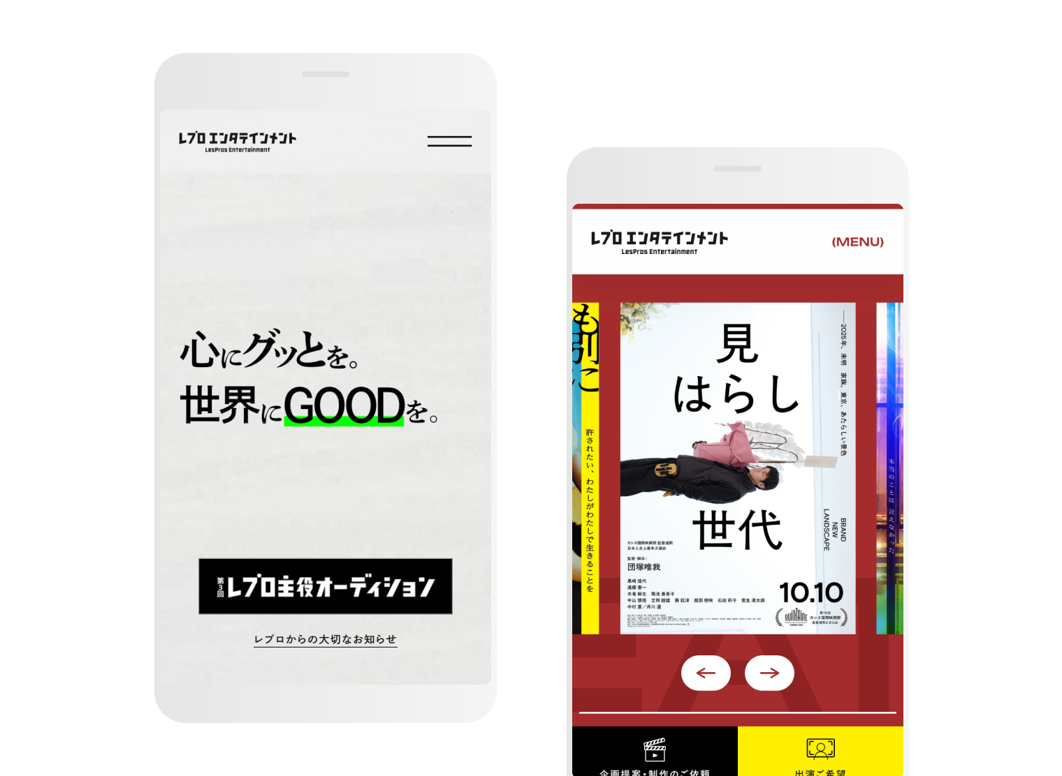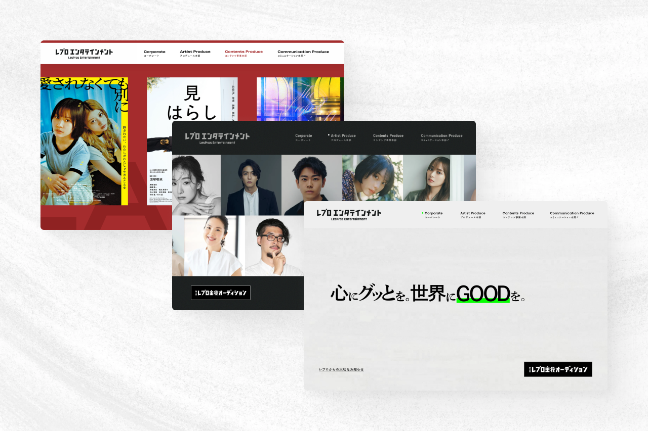 ターゲットや打ち出す特色が、「コーポレート」「アーティストマネジメント事業」「コンテンツ制作事業」の3サイトで大きく異なることから、流入ユーザーを踏まえサイト構成およびトンマナをガラリと変更。コーポレートはMVV「心にグッとを。世界にGOODを。」を踏襲したトーンで、“特色ある各事業部から成るレプロ“であることを表現するハブサイトとして位置づけています。各事業サイトはそれぞれの強みと今後の展望をもとにトーンを策定しました。“総合エンタメ事業会社“を印象付けながら、目的ユーザーにも辿り着きやすく回遊しやすいサイト設計を目指しています。